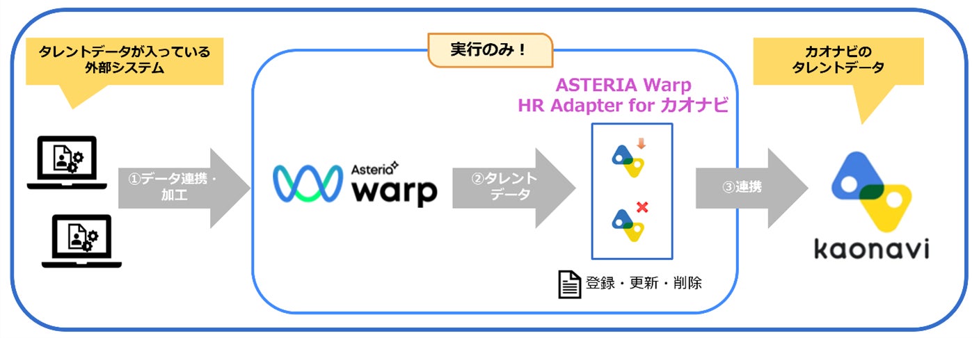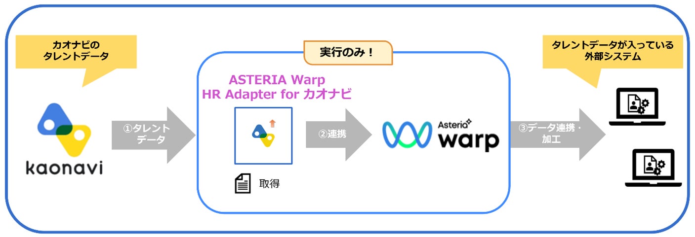 株式会社システナ(本社:東京都港区、代表取締役会長:逸見愛親、証券コード:2317、以下 システナ)、アステリア株式会社(本社:東京都渋谷区、代表取締役社長:平野洋一郎、証券コード:3853、以下 アステリア)、株式会社カオナビ(本社:東京都渋谷区、代表取締役社長CEO:佐藤 寛之、以下 カオナビ)は、国内の企業データ連携(EAI/ESB)製品市場で18年間連続シェアNo.1※1を継続しているASTERIA Warp(アステリアワープ、以下Warp)シリーズのアダプターとして、「カオナビ」とさまざまな外部システムに格納されている人材情報(タレントデータ)との自動連携をノーコードで実現する「ASTERIA Warp HR Adapter for カオナビ」の提供を本日より開始したことを発表します。