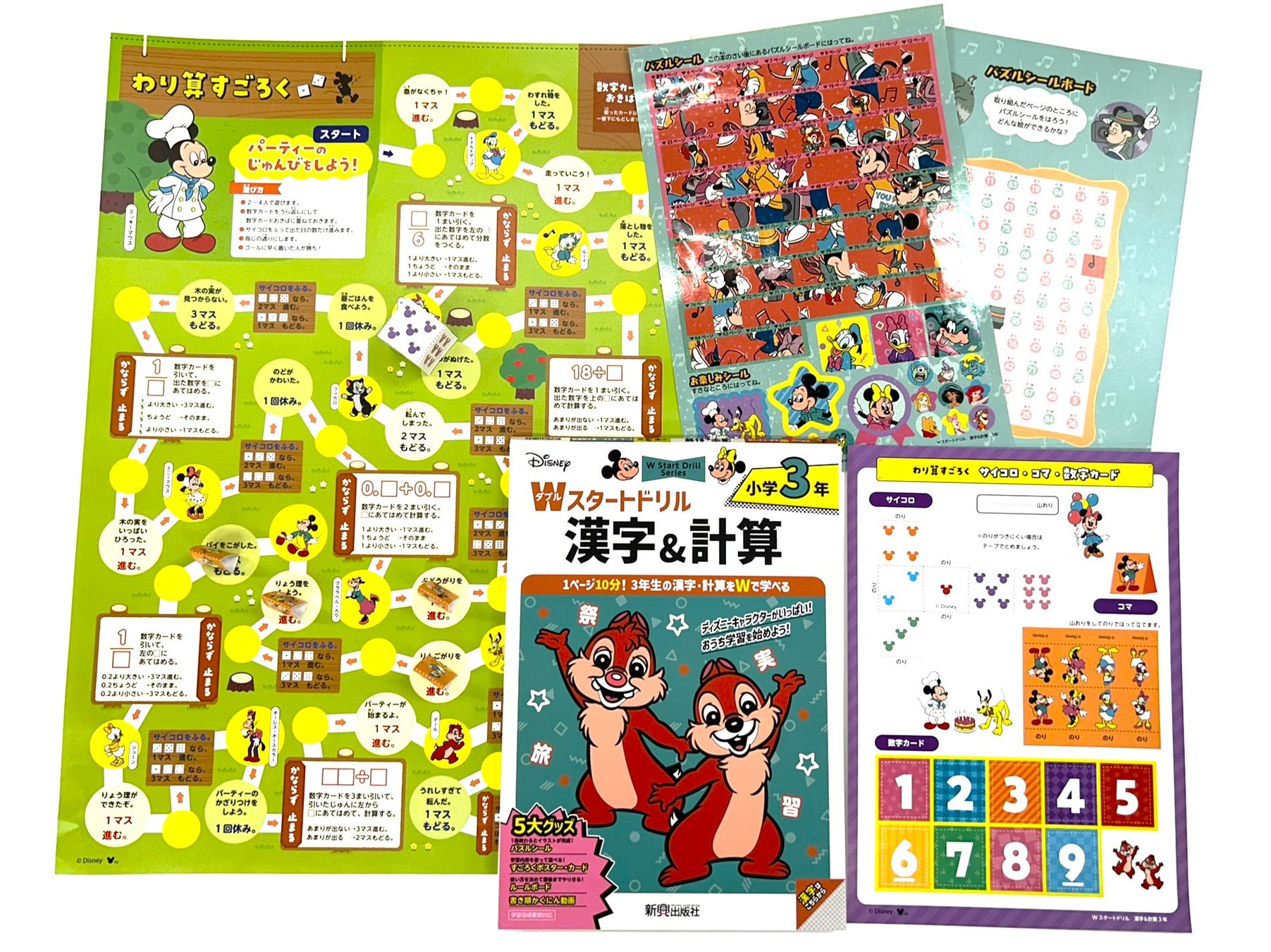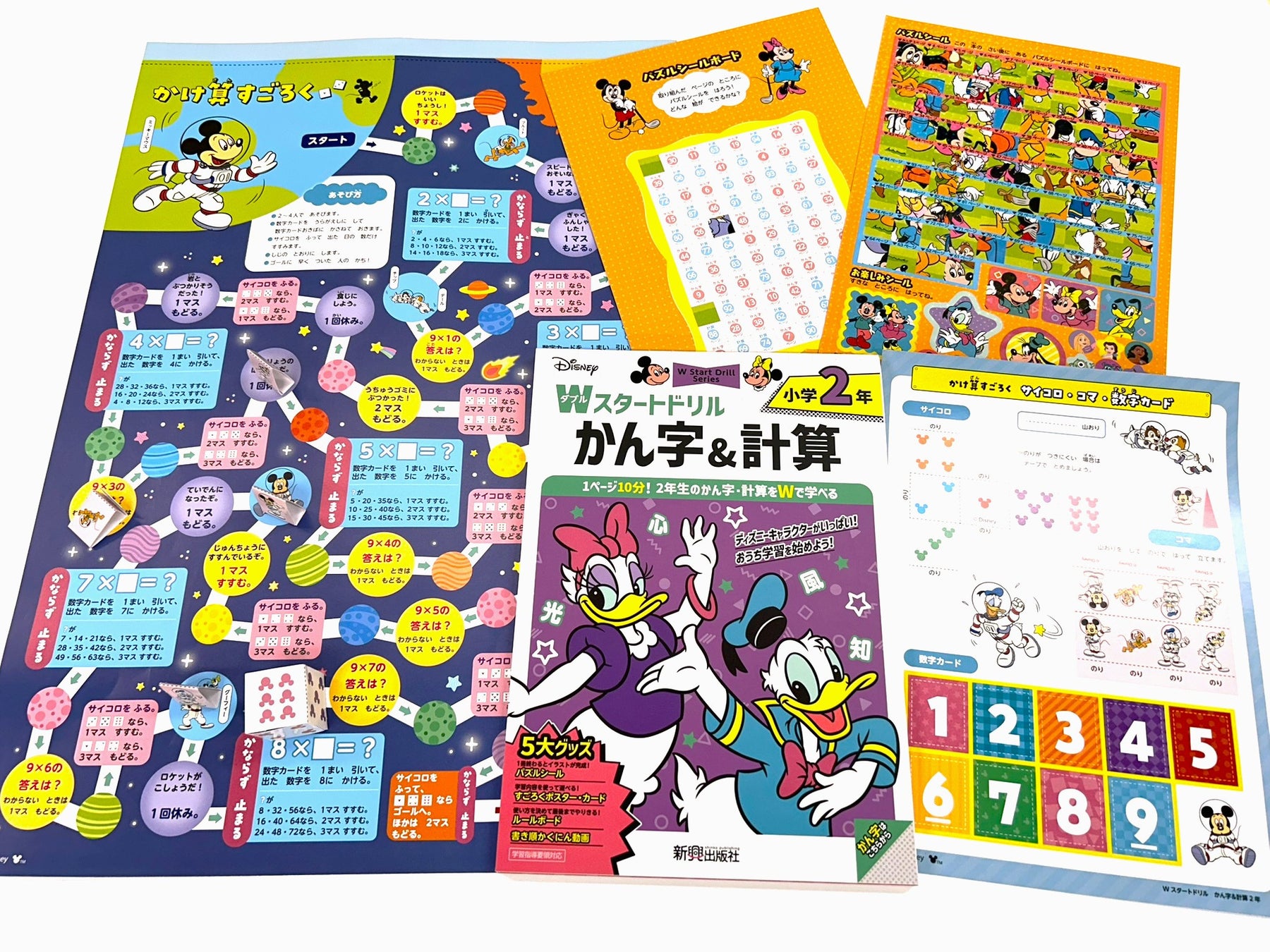 本シリーズは、ウォルト・ディズニー・ジャパン株式会社監修のもと、世界中で愛されるディズニーのキャラクターを多数掲載し、お子さまの学習意欲を最大限に引き出します。さらに、表からも裏からもスタートできる画期的な「W(ダブル)スタート」仕様と、お子さまの達成感を育む「5大グッズ」で、お子さまの「できた!」と「やりたい!」を後押し。忙しい保護者の方々も安心して見守ることができる、新しいおうち学習の形を提案します。