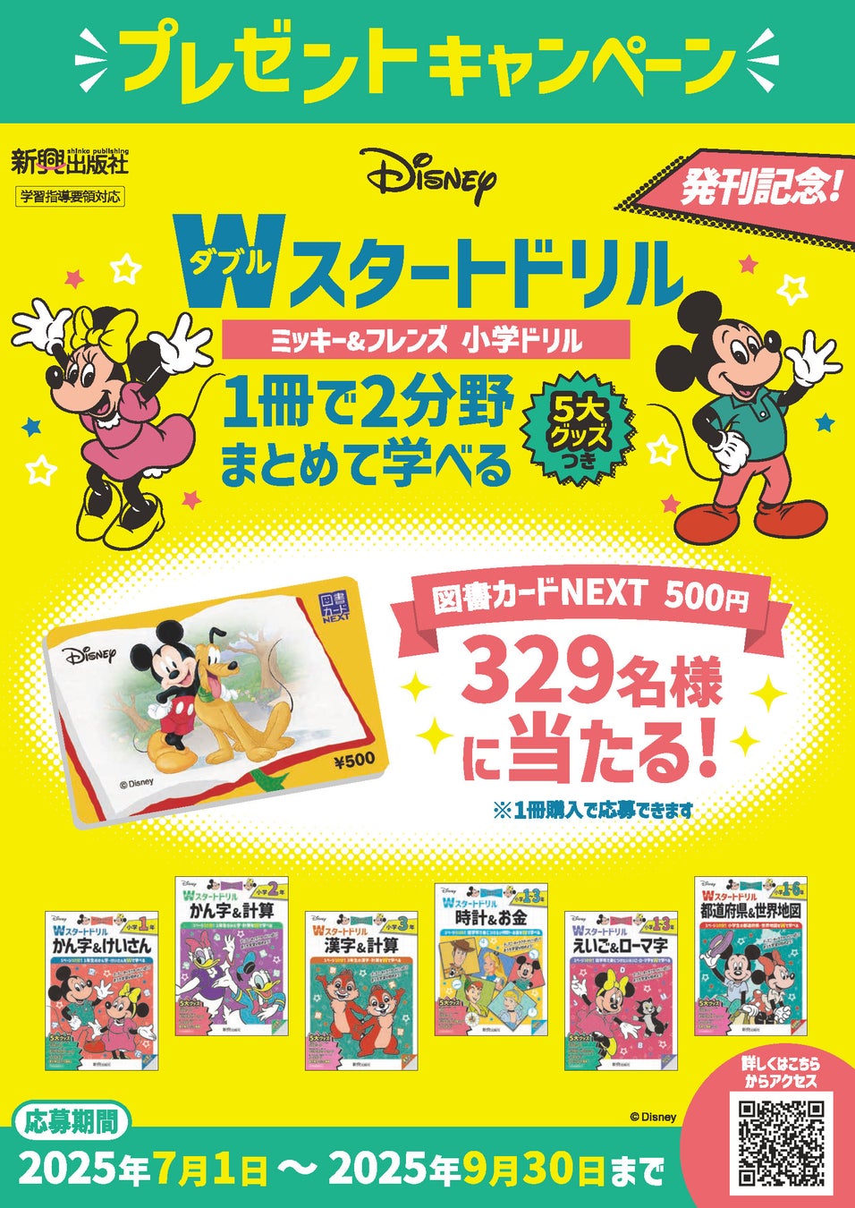 Wスタートドリルをご購入の方に、ディズニーキャラクターがデザインされた図書カードNEXT500円分が329名様に当たります!