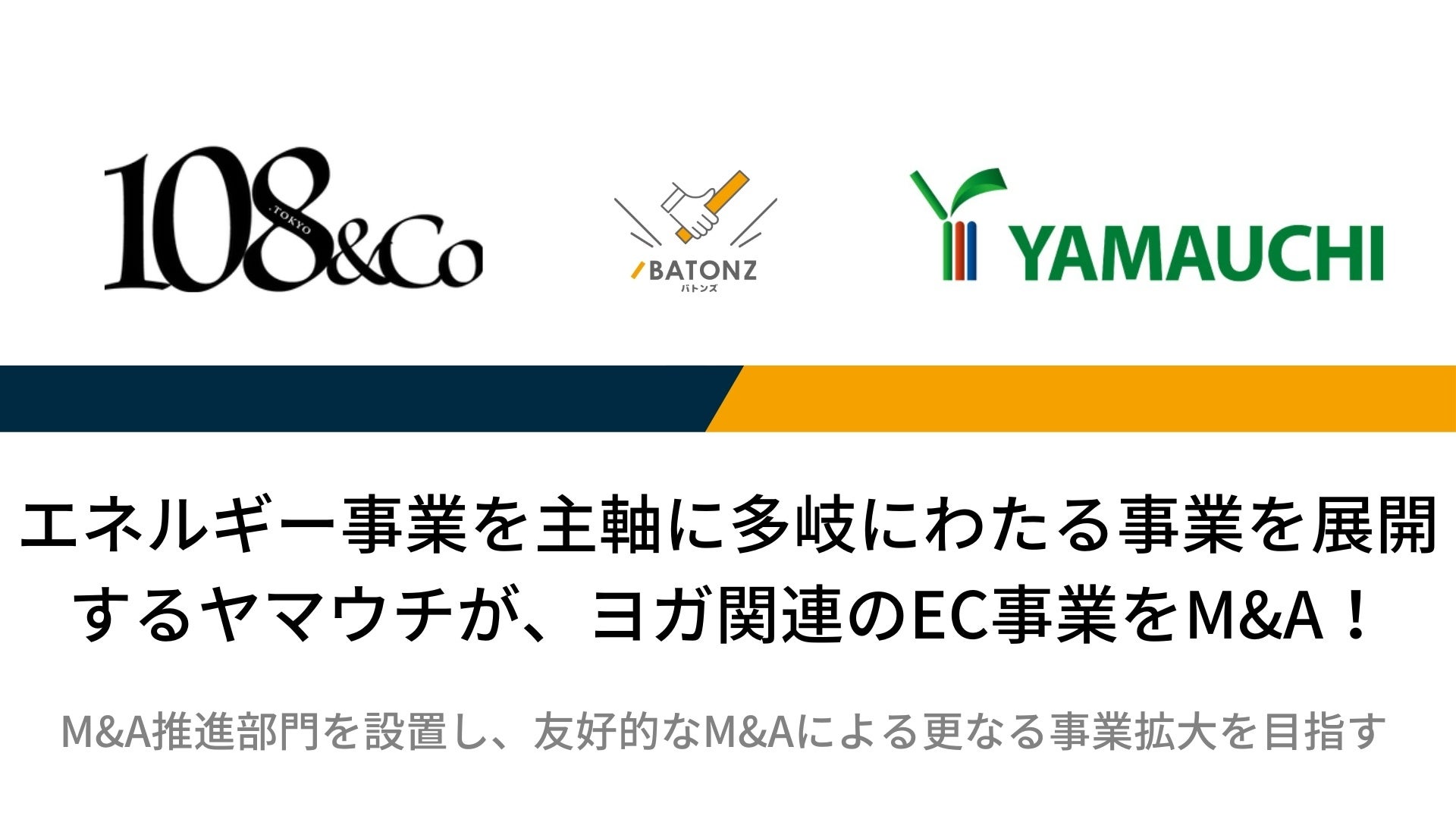 フィットネス関連商品の企画・販売、パーソナルジムの運営を主軸に事業を展開する108.tokyo&Co.は、フィットネス関連のEC事業「108.Tokyo」を事業譲渡されました。これまで多くのM&Aを実施し事業拡大中のヤマウチは、今回のM&Aを皮切りにEC事業の強化にも取り組んでいきます。