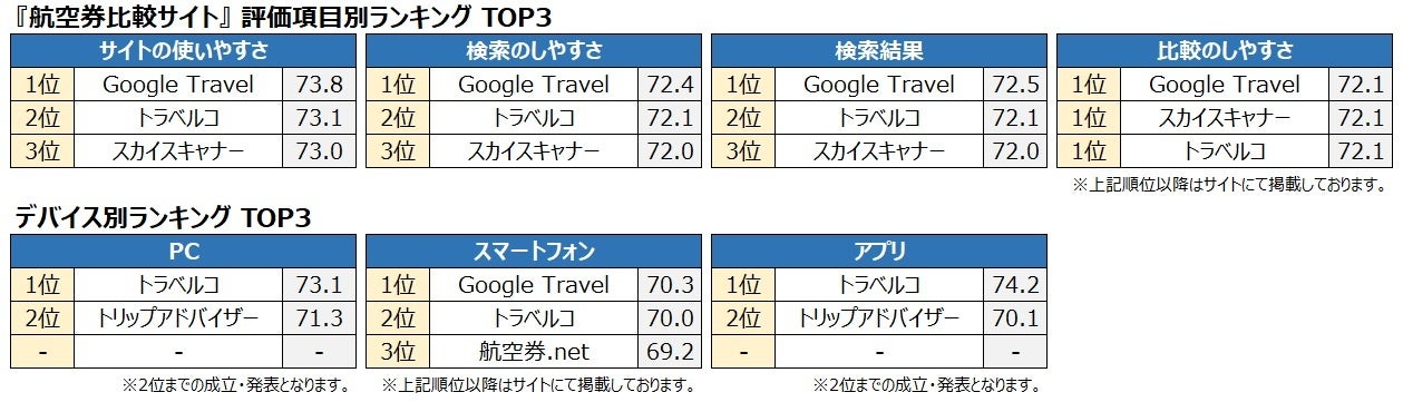 また今回の調査では、【Google Travel(グーグル合同会社 本社:東京都渋谷区)】が、『航空券比較サイト』『ホテル比較サイト』でそれぞれ総合2位に初めてランクイン(前回2020年ではランクイン規定人数に満たず)。『航空券比較サイト』では、評価項目別「サイトの使いやすさ」「検索のしやすさ」「検索結果」「比較のしやすさ」の全4項目のほか、デバイス別「スマートフォン」で1位に。『ホテル比較サイト』では、評価項目別「サイトの使いやすさ」「検索結果」の2項目のほか、デバイス別「PC」で1位を獲得しています。