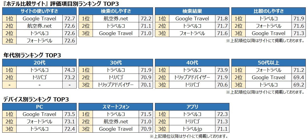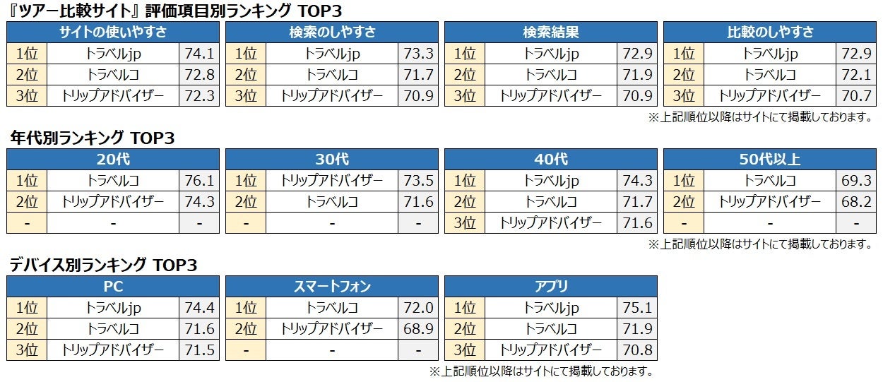 そのほか、総合2位の【トラベルコ】が年代別「20代」「50代以上」、デバイス別「スマートフォン」で1位に。総合3位の【トリップアドバイザー(トリップアドバイザー株式会社:東京都千代田区)】が年代別「30代」で1位となりました。