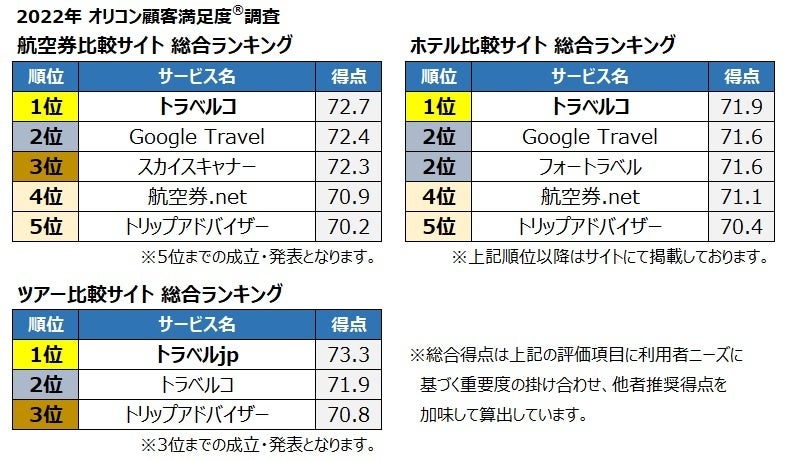 2022年 満足度の高い『航空券/ホテル/ツアー比較サイト』ランキング 【トラベルコ】航空券&ホテル比較サイトで2冠に 【トラベルjp】がツアー比較サイトで初の総合1位に