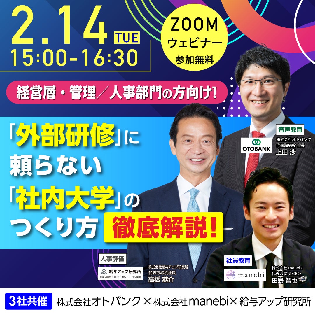 株式会社オトバンク(本社:東京都文京区、代表取締役社長:久保田裕也、以下「オトバンク」)と株式会社manebi(本社:東京都豊島区、代表取締役執行役員CEO:田島 智也、以下「manebi」)、株式会社給与アップ研究所(本社:東京都千代田区、代表取締役:高橋 恭介、以下「給与アップ研究所」)の3社は、経営・人事の担当者向け無料ウェビナーを2月14日(火)に共同で開催いたします。テーマは外部研修に頼らない「社内大学」のつくり方です。「インフレ率を超える賃上げ」が求められる中、従業員の実力をどのように伸ばしていけば良いのか、社員教育や生産性向上で注目の3社が外部研修に頼らずに持続的な学習へとつながる社内大学のつくり方について徹底的に解説いたします。