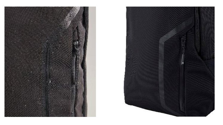 大切な小物(貴重品や電子機器等)を入れることが多い正面ポケットには、水の流れをコントロールして侵入を軽減する【STREAMLINE】を配置。ポケットも止水ファスナーを使用しています。