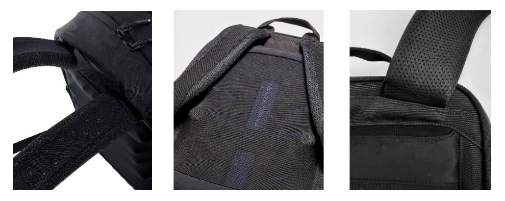 背面に加え、ショルダーハーネスもパンチング仕様にすることで肩周辺の不快感も軽減。更に、ショルダーの付け根を肩の形状に沿うように「ハの字」設計で縫製することにより肩への負荷が全体に分散され、体感としても軽く、体への負担も軽減されることが期待できる設計に。厚みがありクッション性もあります。