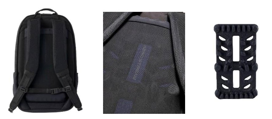 背中の蒸れを軽減する独自設計のエアロストリームパネルを搭載。当社の研究開発拠点である「DISC OSAKA」で検証された【換気理論(Air flow theory)】に基づき、背中に空気の入口と出口をつくり、衣服の内熱気や湿気に対して換気効果を発揮します。従来品のオレンジ色から、ブランドカラーのネイビーにアップデート。よりタウン・ビジネスで使いやすいカラーリングに。さりげなく AERO STREAM ロゴは背中心に刻印。パネルの上下部分には、肩や腰部との摩擦による衣類への悪影響と製品の耐久性を考慮し、別生地を配置しています。