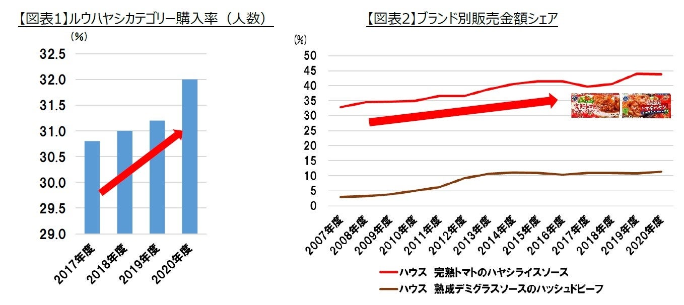 ハヤシライスのメニュー価値が見直されていることに伴い、ルウハヤシカテゴリーの購入率は年々上昇基調にあります(図表1)。また、その中で「完熟トマトのハヤシライスソース」 は2007年度から2020年度までブランドシェアNo.1で製品・コミュニケーション施策によって着実にシェアを伸ばし続けています(図表2)。なお、ルウハヤシカテゴリーにおけるメーカー別販売金額では、ハウス食品のシェアは70%を超えています。※