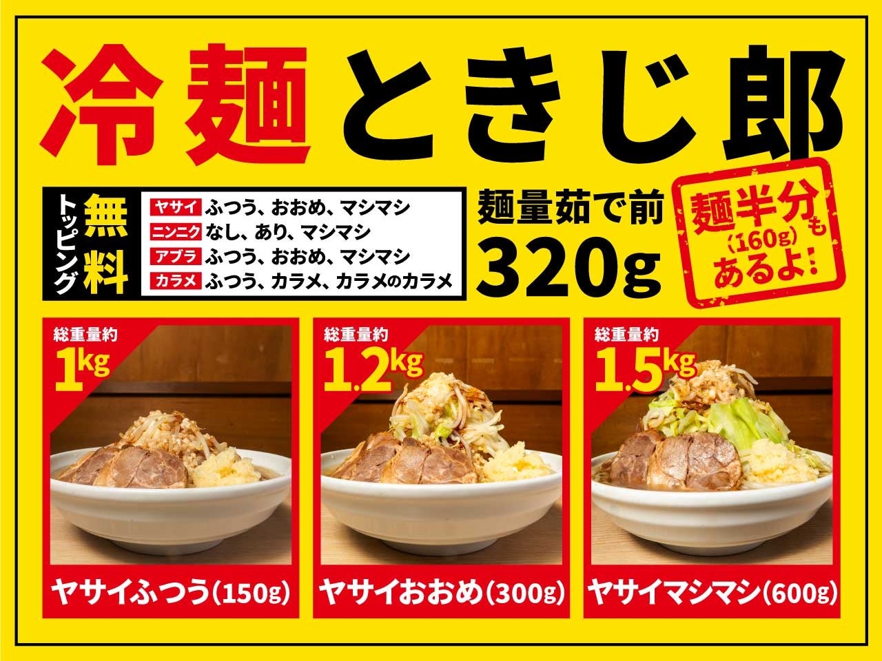 今年は、担当者が以前より「ラーメン二郎」の大ファンで、本家へのリスペクトを込めて企画しました。二郎そのものを完全に再現することは難しかったのですが、二郎ファンにもお楽しみいただけるメニューを開発しました。今回登場する「ときじ郎 冷麺」は、冷麺の清涼感はそのままに、背油・ニンニクがガツンと効いたパンチのある商品です。450gの麺に、たっぷりの野菜、ニンニク、背油をトッピングした総重量約1kg以上の冷麺です。無料で、野菜、ニンニク、背油(アブラ)、醤油だれ(カラメ)を「普通」から「マシマシ」までお好みで注文いただけます。