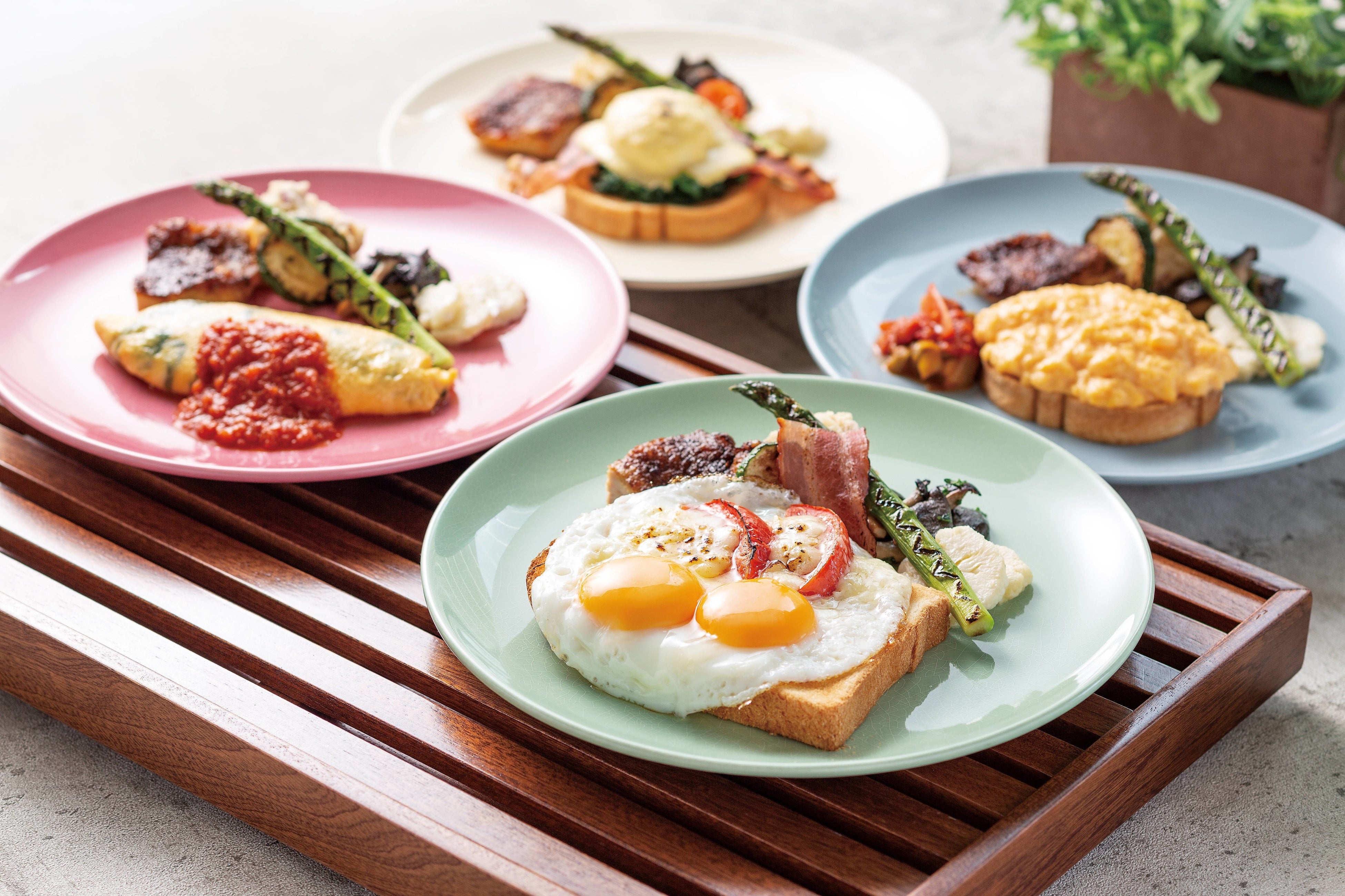 「トマトとチーズのせフライドエッグトースト 黒胡椒風味 ベーコン添え」/「ホウレン草入りオムレツ トマトソース添え」/「ベーコンのエッグベネディクト オランデーズソース」/「スクランブルエッグトースト スパイシーラタトゥイユ添え」