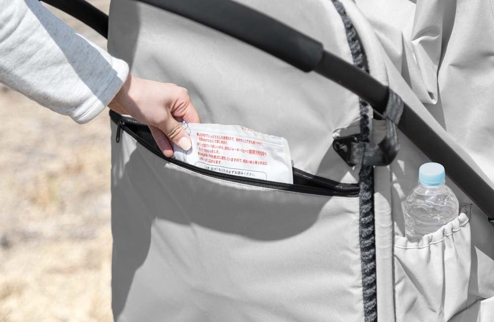 本製品の背面には、お散歩グッズやワンちゃんのおやつなどを収納できるポケットを、側面にはドリンクホルダーを設けています。ワンちゃんの持ち物はもちろん、飼い主さんの荷物もすっきりと収納できるため、より快適にお散歩をお楽しみいただけます。