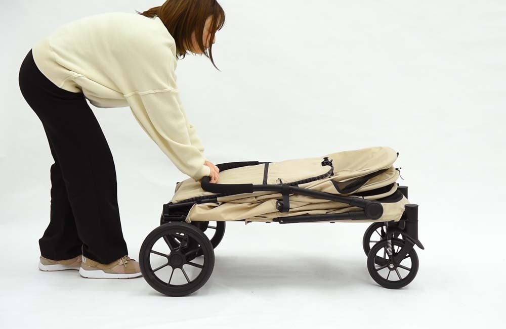 ペットカートにおいて、快適性だけでなく飼い主さんが扱いやすいよう折りたたみやすさや収納のしやすさも重視されます。そのため、本製品はワンタッチで簡単に折り畳むことができ、女性一人でも手軽に収納可能です。折りたたんだ状態では、側面にロックパーツが装備されており、広がりを防いでしっかりとまとめることができます。