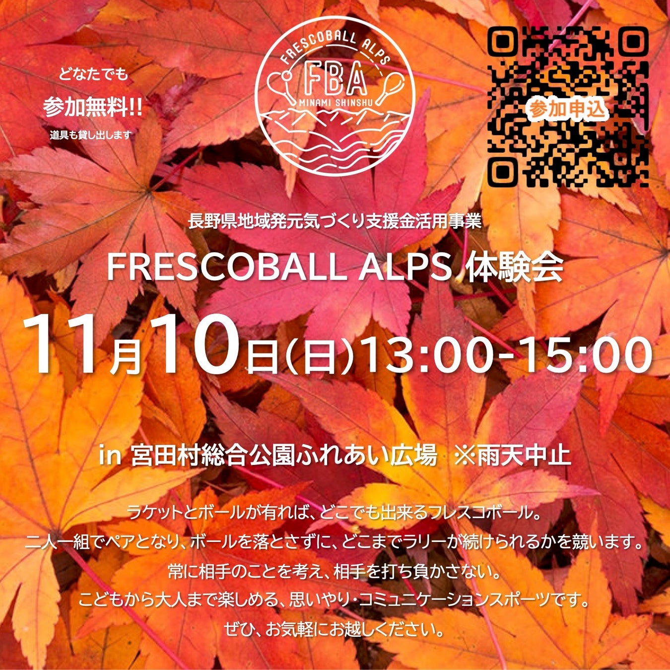 コミュニケーションデザインスポーツ ”フレスコボール" の国内における普及活動を行っている日本フレスコボール協会(以下 JFBA、代表理事 窪島剣璽)は、公認地域クラブの「FRESCOBALL ALPS」(長野県駒ヶ根市)が、11月10日(日)に宮田村総合公園ふれあい広場にて、フレスコボール無料体験会を実施することを発表いたします。