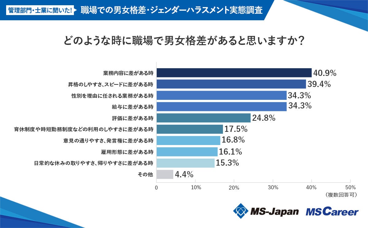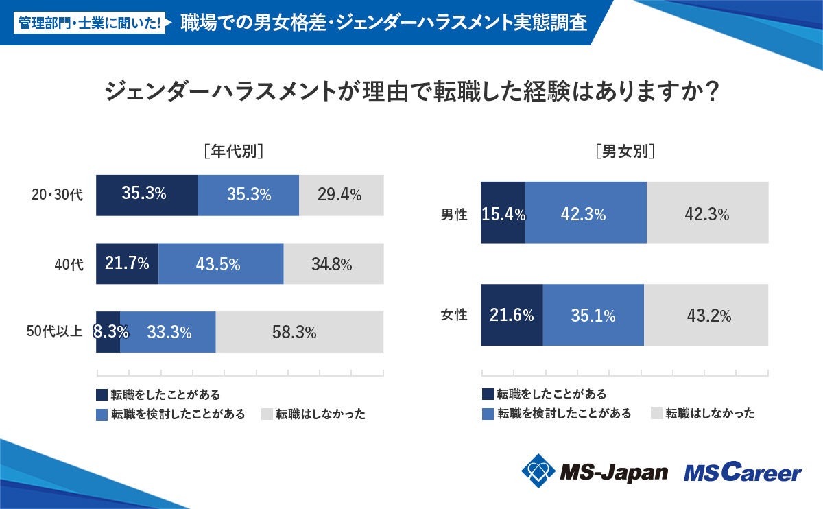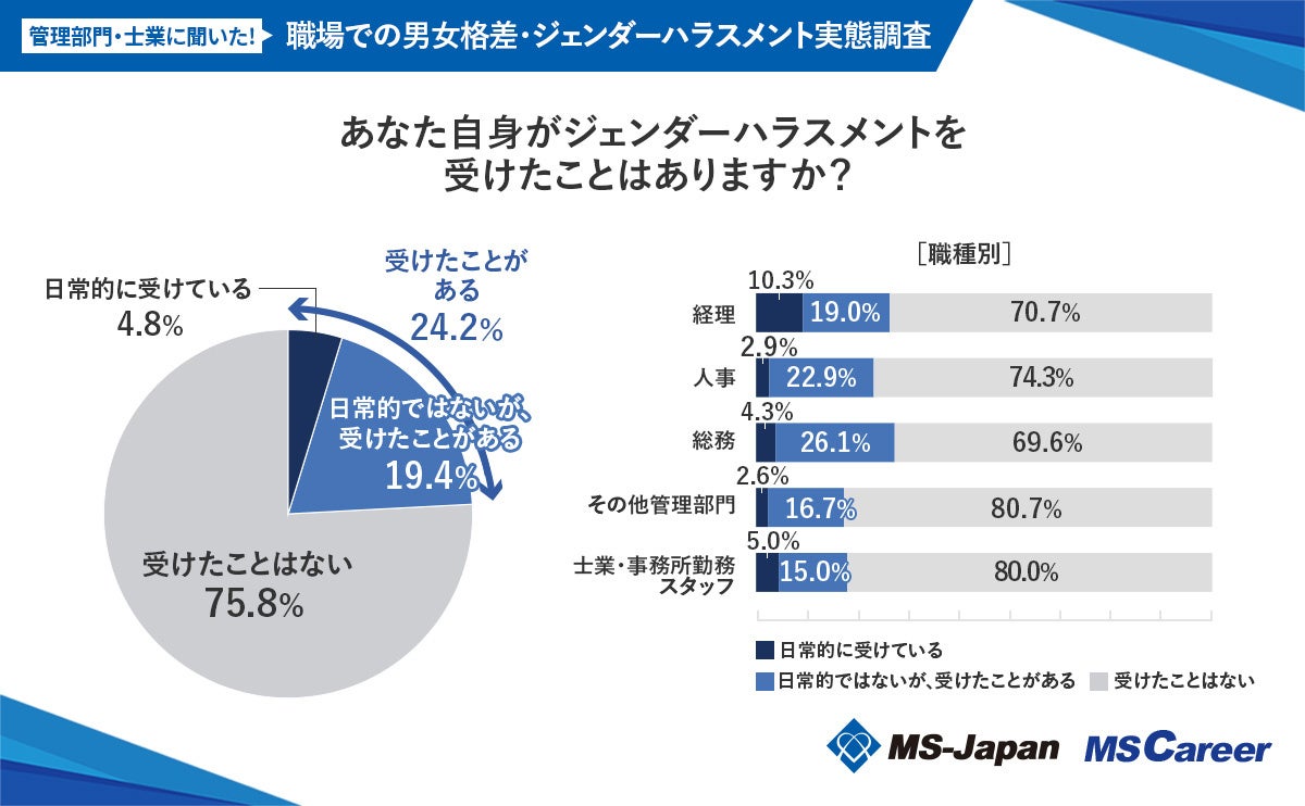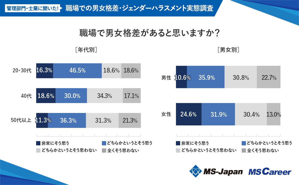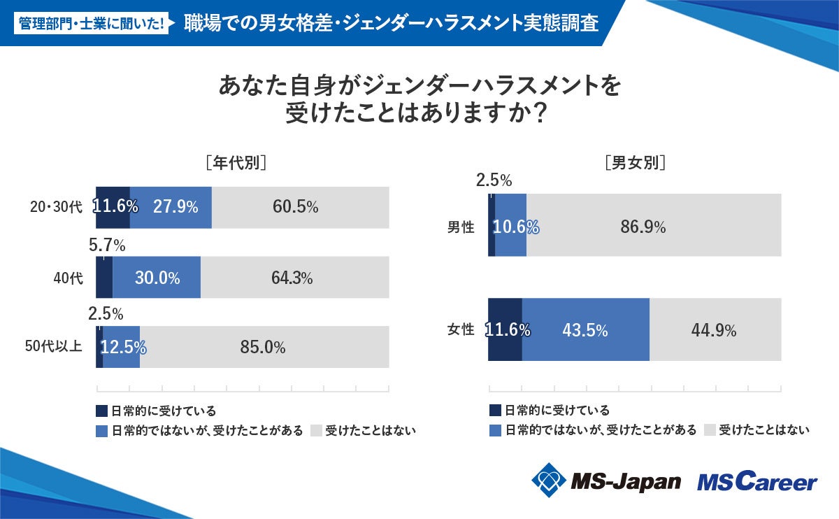 この度、MS-Japanが運営する管理部門・士業の総合転職サービス「MS Career(エムエスキャリア)」は、【職場での「男女格差・ジェンダーハラスメント」に関する実態調査】を発表いたしました。