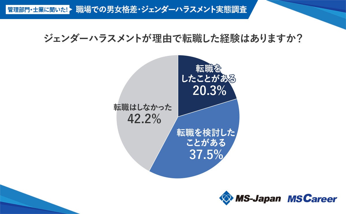 「転職をしたことがある」が20.3%、「転職を検討したことがある」が37.5%と、合計57.8%が、ジェンダーハラスメントが転職意欲に影響を与えたと回答しています。