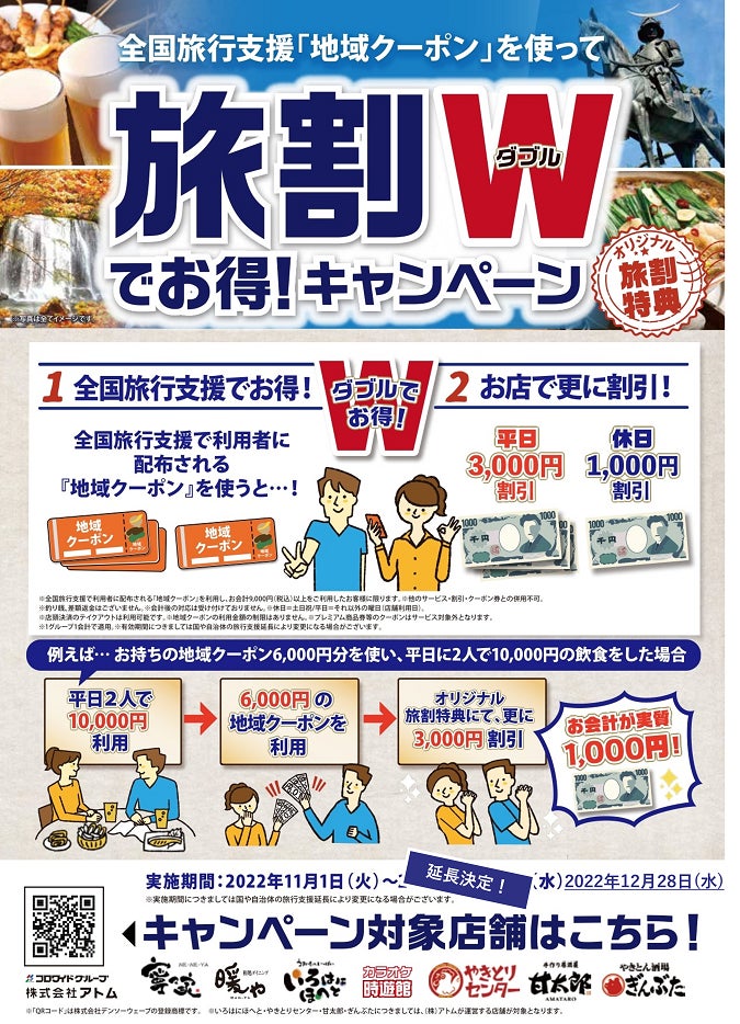 コロワイドグループの株式会社アトム(本社:神奈川県横浜市、代表取締役社長:山角豪)は居酒屋「寧々家(ねねや)」「暖や」「いろはにほへと」「やきとりセンター」「甘太郎」「ぎんぶた」「時遊館(じゆうかん)」の対象店舗で、2022年11月1日(火)より全国旅行支援地域クーポンご利用のお客様を対象に「旅割 Wでお得!キャンペーン」を実施しておりましたが、ご好評につき12月28日(水)まで延長いたします!
