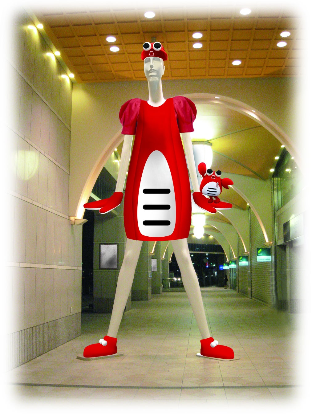 ナナちゃん×かに丸くん 愛知県蟹江町、名古屋駅前のランドマーク「ナナちゃん人形」を町公式キャラクター「かに丸くん」に変身させてPR