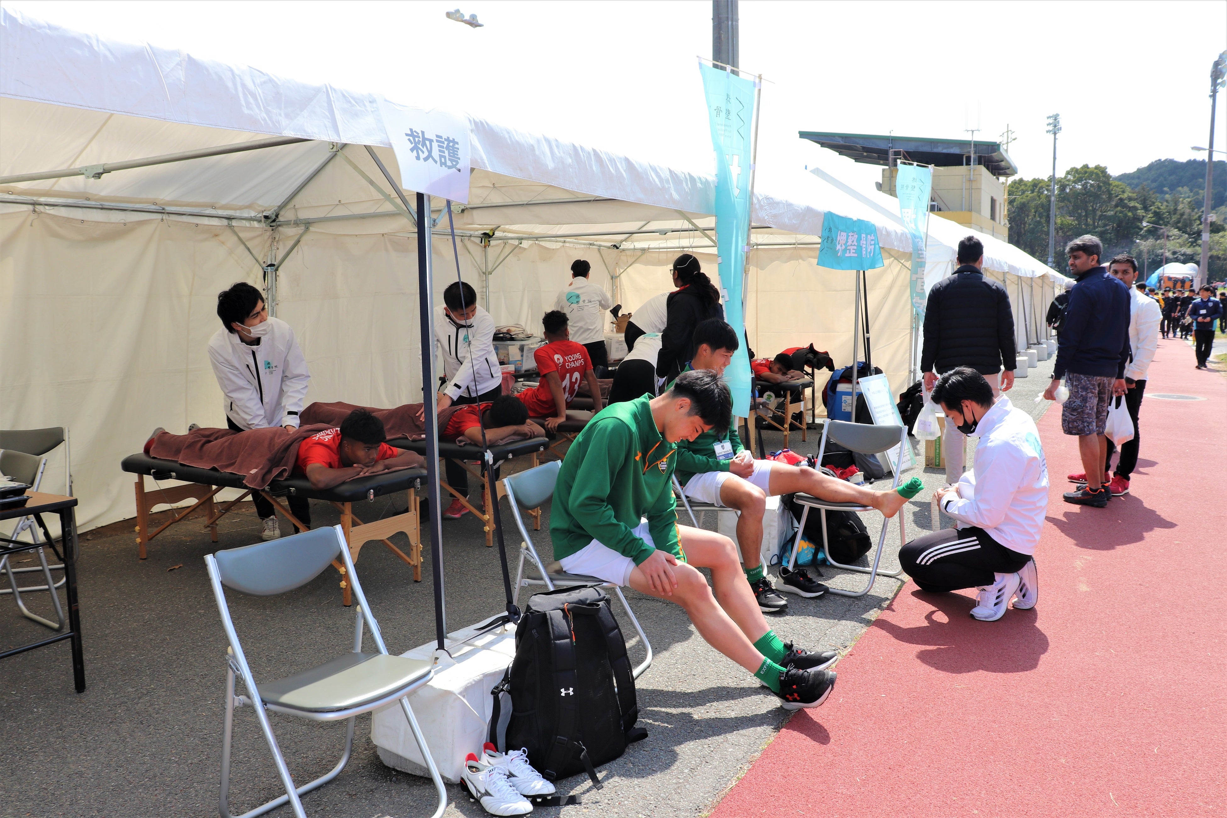 試合が始まると熱量の高い試合が多く、ケガをする選手も多くいました。ケガをした選手は、そのまま試合に出れるのかと不安な様子で救護ブースを訪れていましたが、即急かつ的確な対応もあり、安心した様子で元気よく試合に戻っていました。