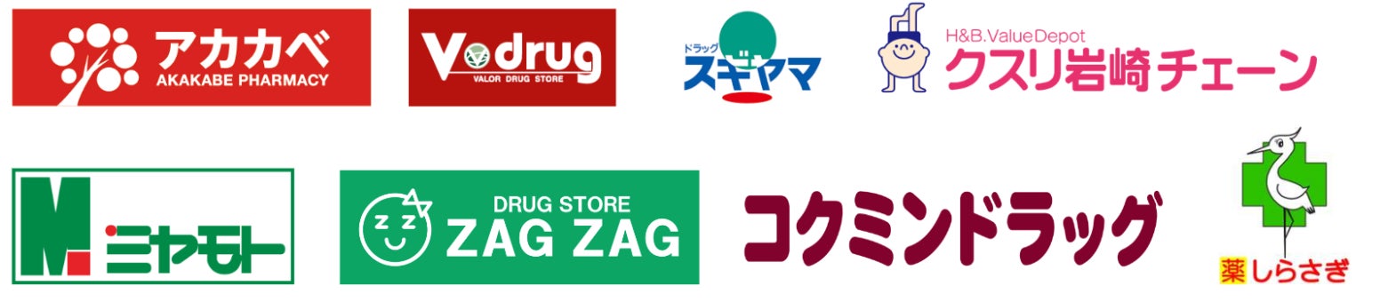 「アカカベ」「クスリ岩崎チェーン」「コクミン」「ザグザグ」「しらさぎ薬品」「ドラッグスギヤマ」「V・ドラッグ(ブイドラッグ)」「ミヤモトドラッグ」