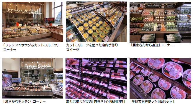 同店は、1階と2階で構成され、1階には店内手作り商品を中心とした総菜・ベーカリー売場とお酒・冷凍食品の売場、2階には青果・鮮魚・精肉の生鮮食品と加工食品・日配品を取り揃えています。生鮮売場で販売している鮮度のよい素材を使い、店内で製造した総菜、半調理品、デザートやサンドイッチを数多く取り揃えています。「調理は簡単に、でも素材にはこだわりたい」というお客様を選ぶのが楽しくなる売場でお迎えします。