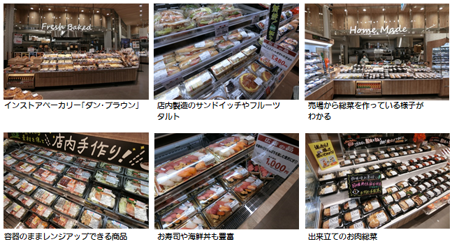 入口を入るとインストアベーカリー「ダン・ブラウン」と総菜売場が広がります。ベーカリー売場では、専用窯で焼き上げたピッツァや店内製造のサンドイッチをはじめ、フルーツタルト、各種パンなどを出来立てで提供します。総菜売場では、2階の生鮮売場で販売している鮮度のよい食材を使って店内で調理した焼魚・煮魚やお肉総菜、お弁当などを販売。切りたての原料を使用した「にぎり寿司」や「ローストビーフ丼」、店内で盛り付けしたレンジアップ商品など、品揃えも豊富です。