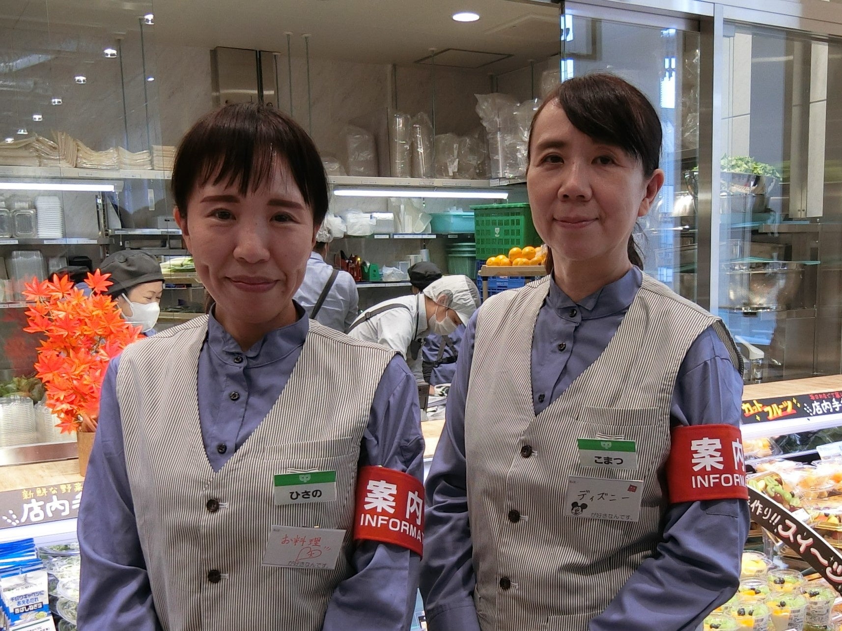 売場を巡回し、お客様とのコミュニケーションを専任で行うスタッフです。商品やサービスのことはもちろん、食べ方やメニューの相談など、お気軽にご相談ください。赤い腕章が目印です。