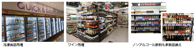 フロアの奥には冷凍食品・アイスクリームとお酒の売場があります。冷凍食品は、お弁当用の商品や、あると便利な冷凍野菜・果物、本格的な味が楽しめる冷凍スイーツも充実させました。お酒売場では、ワイン・缶チューハイ・ノンアルコール飲料など、嗜好性の高い商品を種類豊富に取り揃え、選ぶ楽しみのある売場を実現しました。