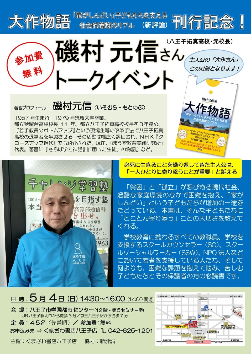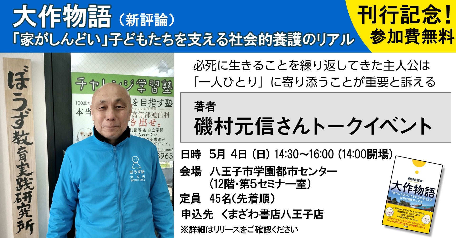 『大作物語-「家がしんどい」子どもたちを支える社会的養護のリアル』の編者・磯村元信さんトークイベントを、5月4日(日) 八王子市学園都市センター(12階・第5セミナー室)にて開催します