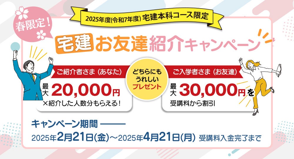 資格取得支援スクールの日建学院を運営する株式会社建築資料研究社(所在地:東京都豊島区、代表取締役社長:馬場栄一)は、2025年度(令和7年度)に宅地建物取引士試験を受験される方向けに春限定の「宅建 お友達紹介キャンペーン」を実施いたします。紹介いただいたお友達が2025年度(令和7年度)宅建本科コースにご入学すると、ご紹介者・ご入学者それぞれにお得な特典をプレゼントいたします。