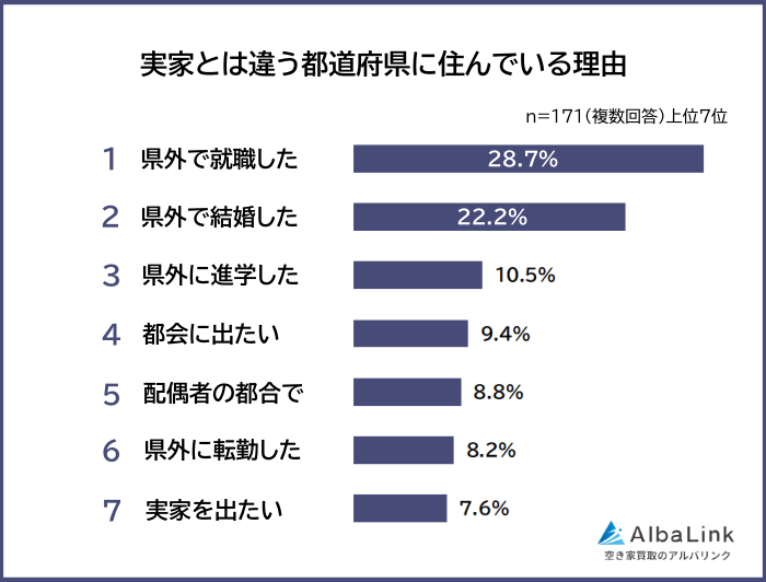 続いて、実家と違う都道府県に住んでいる人に理由を聞いたところ、1位は「県外で就職した(28.7%)」、2位は「県外で結婚した(22.2%)」でした。3位「県外に進学した(10.5%)」、4位「都会に出たい(9.4%)」、5位「配偶者の都合で(8.8%)」が続きます。