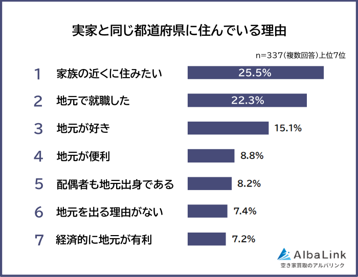 「実家と同じ都道府県に住んでいる理由」の1位は「家族の近くに住みたい(25.5%)」でした。2位「地元で就職した(22.3%)」、3位「地元が好き(15.1%)」が続きます。
