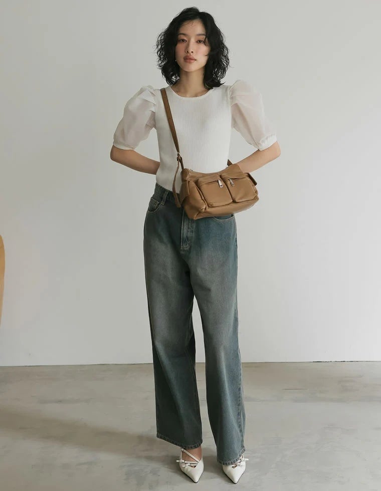 商品名:無地orドットオーガンジードッキングパフスリーブトップス