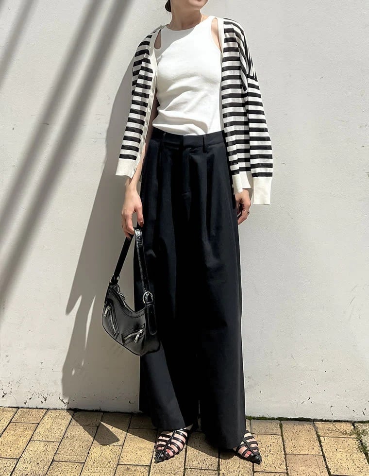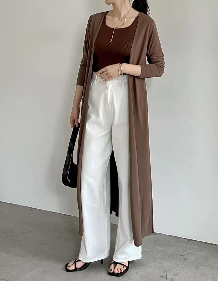 さっと羽織るガウンタイプのカーディガンは、縦のラインを強調しスタイルアップも◎
