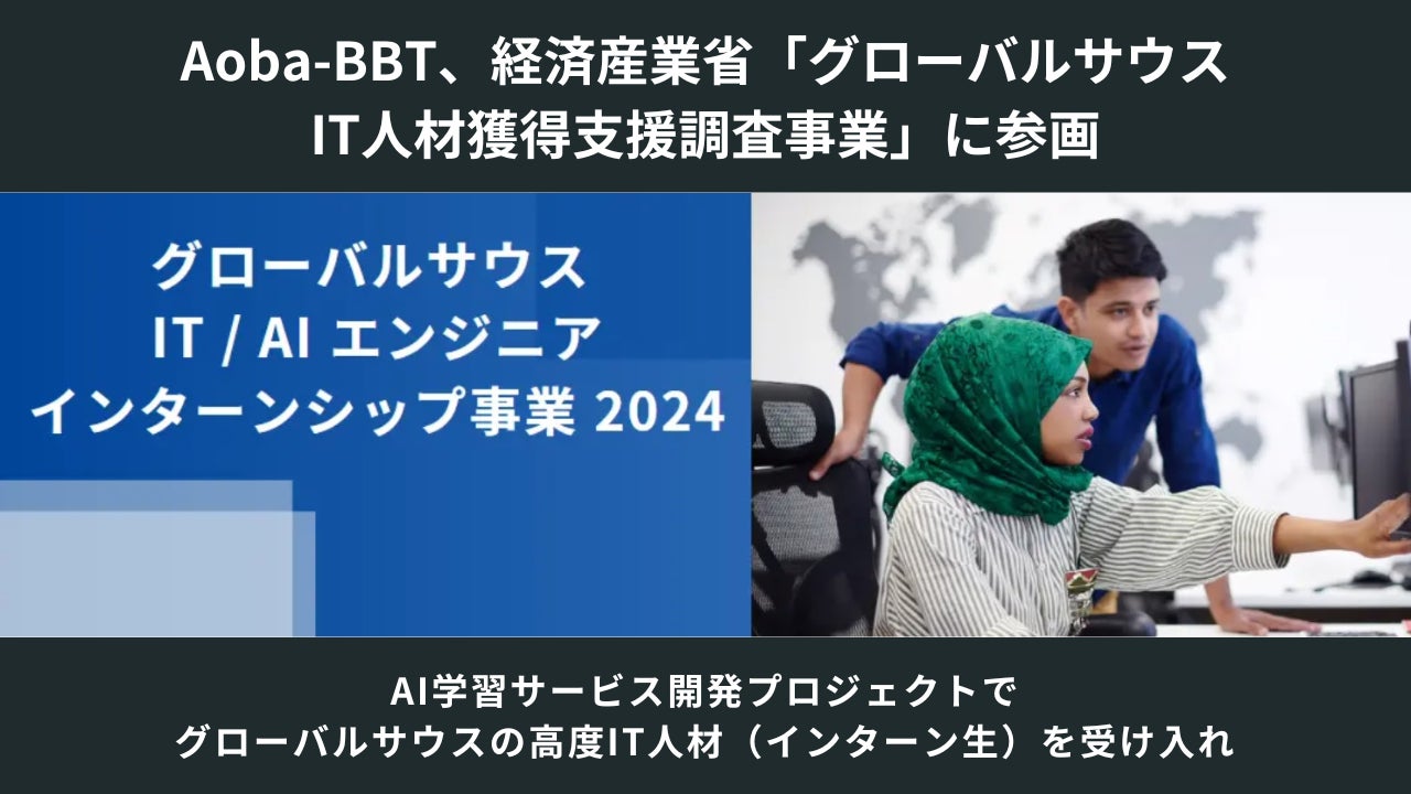 株式会社Aoba-BBT(所在地:東京都千代田区、代表取締役:柴田巌、以下「Aoba-BBT」)は、経済産業省が推進する「令和5年度補正グローバルサウス未来産業人材育成等事業(グローバルサウスIT人材獲得支援調査事業)」に参画し、2024年10月から12月にかけて、計4名のインターン生を受け入れることを決定いたしました。これらの高度なITスキルを持つインターン生は、Aoba-BBTおよび関連会社であるAoba-BBT Globalが進行中のAI学習サービス開発プロジェクトに参画します。