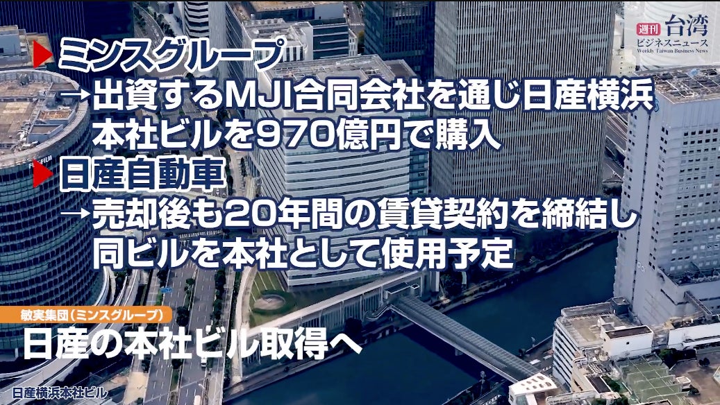 経営再建中の日産自動車は6日、神奈川県横浜市の本社ビルを、香港上場の台湾系自動車部品大手、敏実集団(MINTH、ミンスグループ)などが出資するMJI合同会社(東京都中央区)に970億円で売却すると発表した。売却予定日は12月12日。
