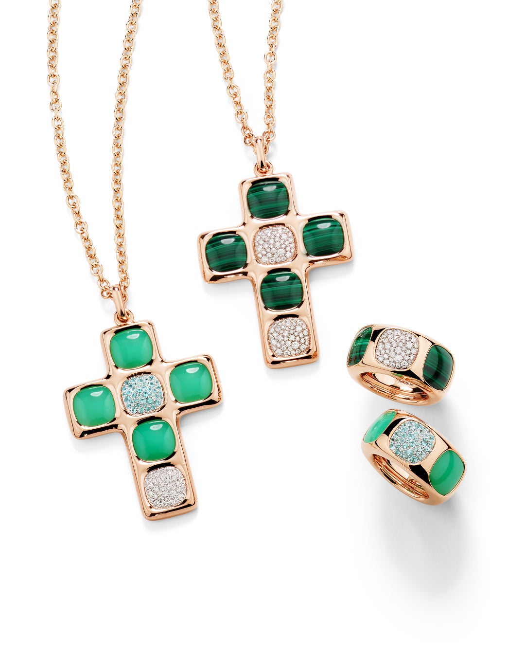 クロスペンダントはコレクションを象徴する最も挑発的なピースであり、豪奢でありながらも簡素な印象を併せ持ち、古代のシンボルを現代的な視点で再解釈しています。選び抜かれたジェムストーンがローズゴールドの直線的なシルエットの上で大胆なコントラストを描き出します。