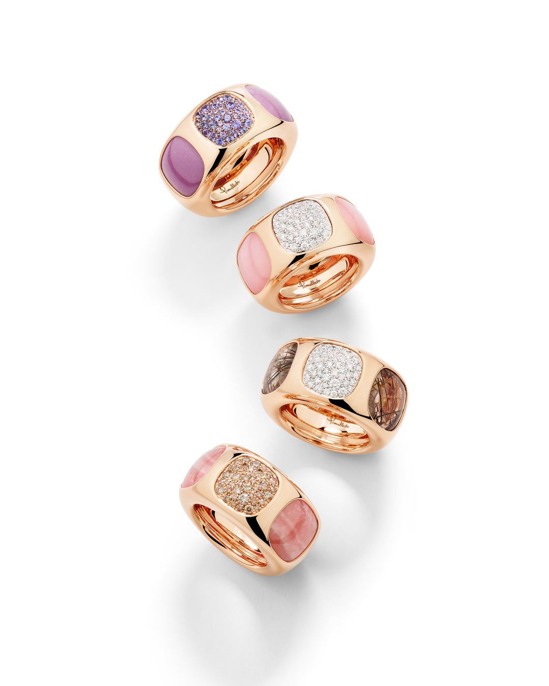 ポメラートの色彩美学は、透明と不透明の対話にあります。鮮やかなクリスタルの色調と艶やかなハードストーンの組み合わせが、繊細なパヴェによって奥行きを増し、存在感を高めます。意外性に満ちた組み合わせは、ミラノらしい感性の象徴。洗練されながらも遊び心に富み、自然体でありながら緻密に構成されています。