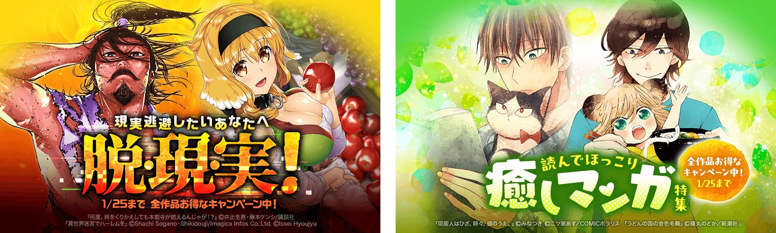 「LINEマンガ」では、1月12日(金)から1月25日(木)まで「脱・現・実!特集」と「ほっこり癒しマンガ特集」を開催します。