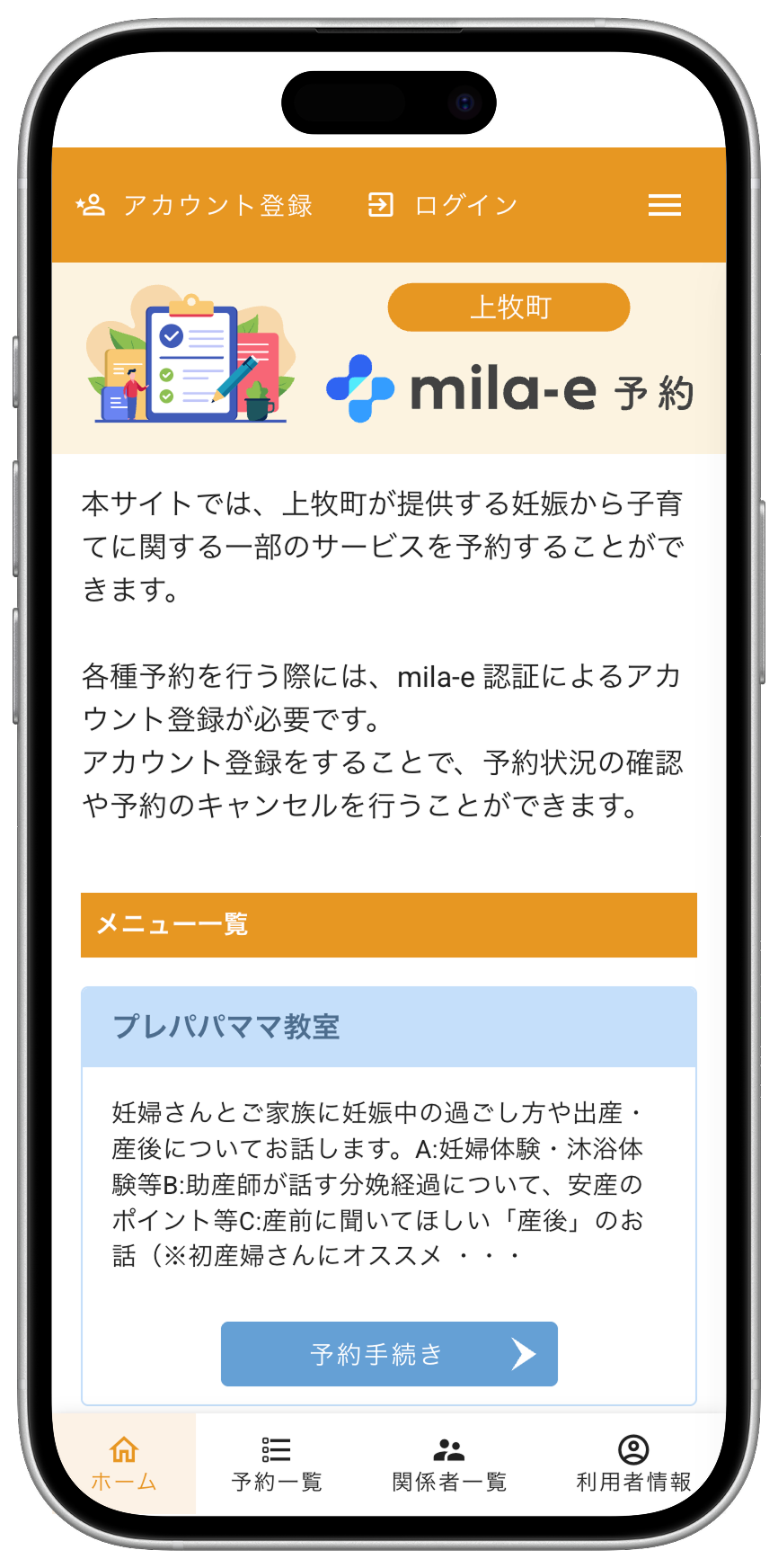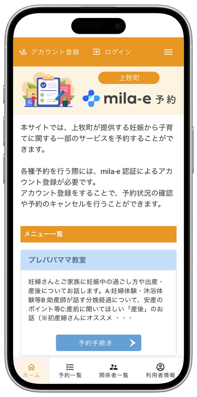 今回 同アプリに続いて、オンライン予約「mila-e 予約」を導入する運びとなり、プレパパママ教室・離乳食教室・乳幼児相談を対象に運用を開始しました。