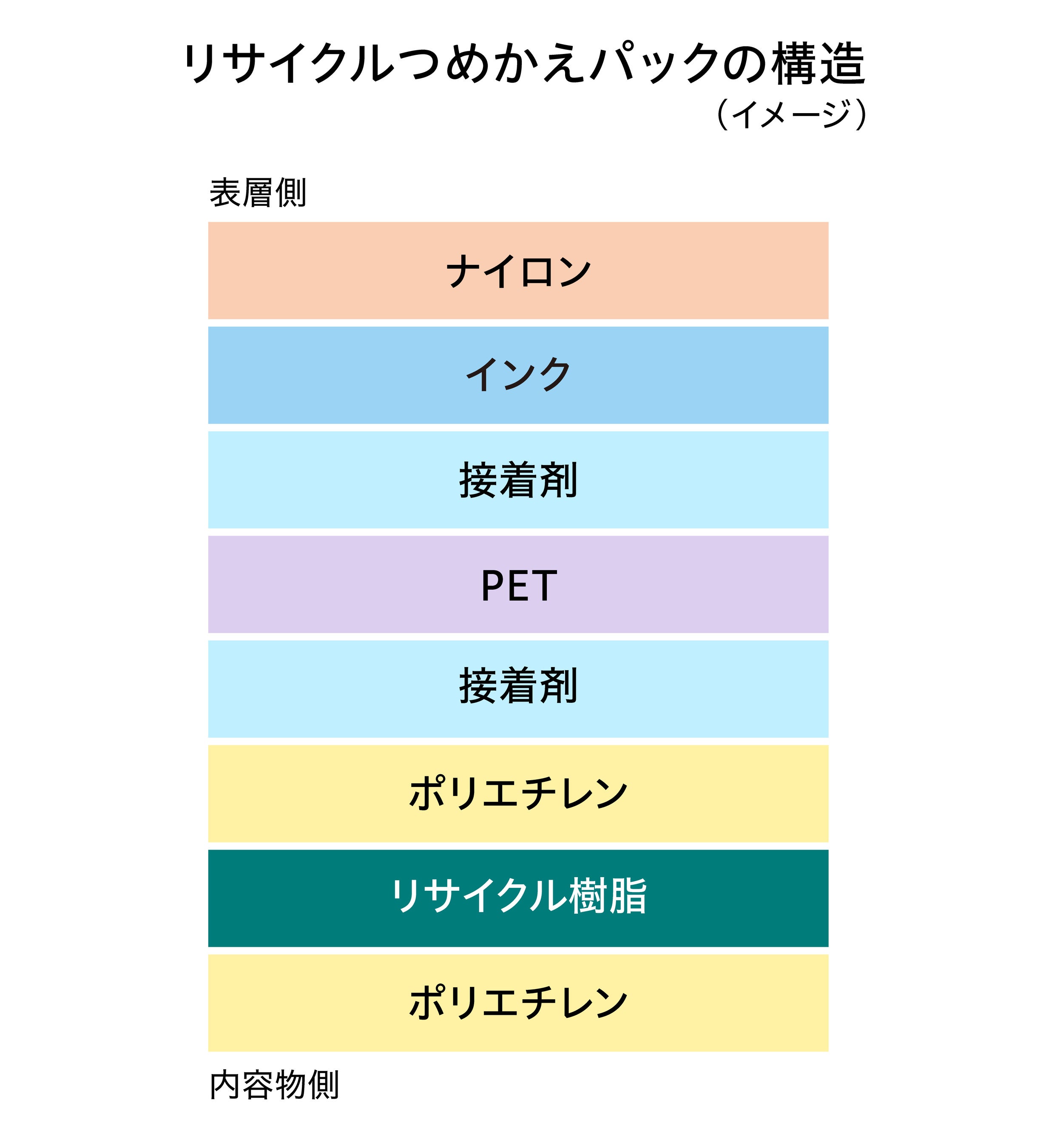 日本の日用品市場では、花王・ライオンをはじめとする日用品メーカーが、1990年代から包装容器プラスチック使用量の削減を進めてきました。内容物の濃縮化による製品容器のコンパクト化、つめかえ・つけかえ用製品の開発・普及により、プラスチック使用量を大幅に削減しました。2021年のつめかえ・つけかえ用製品は、全製品出荷量の約80%となっています*2。一方、つめかえ用製品であるつめかえパックは、主に使われているフィルム素材が複合材料からなるため、リサイクル材が多種類の成分からなる不均質なプラスチックとなり、リサイクルが困難な状況でした。また、日用品のプラスチック包装容器については分別回収のしくみが確立していないことや、消費者に対しリサイクルの必要性が伝えきれていないという課題もありました。