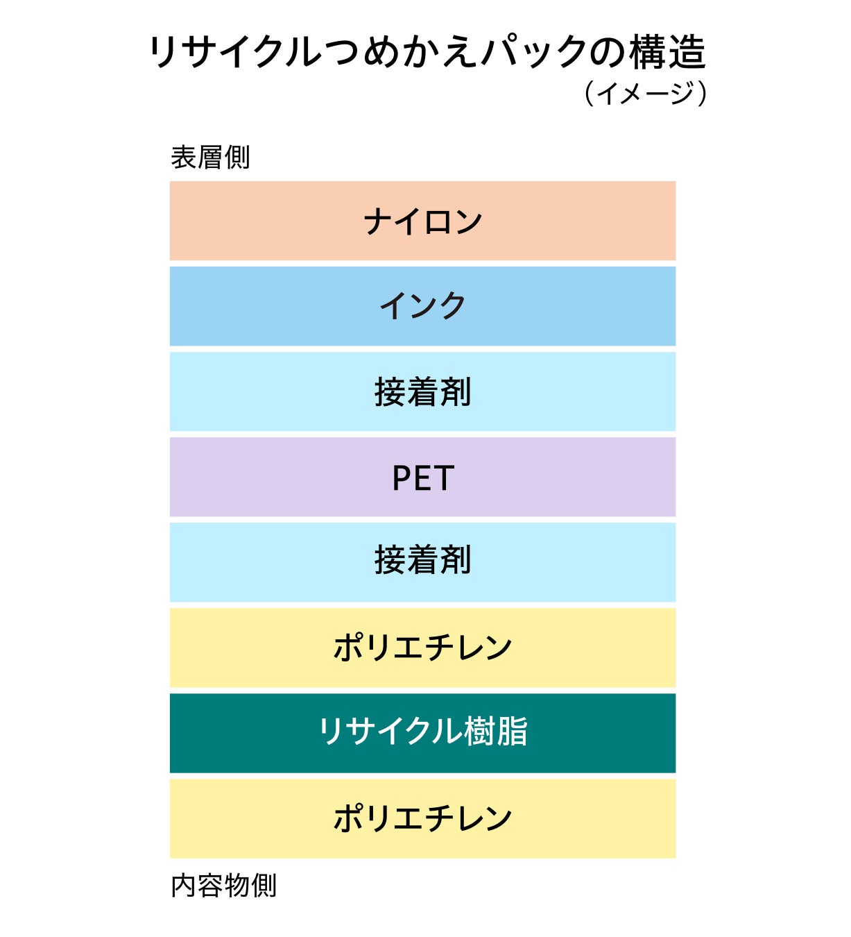 また、リサイクルした材料は約10%使用されています。これまでに花王が回収を実施してきた自治体のものに加え、花王・ライオンの協働で回収の実証実験を展開している総合スーパーのイトーヨーカドー曳舟店、ウエルシア薬局で回収したものが、今回のリサイクルつめかえパックに一部活用されています。リサイクルつめかえパック全体の材料のうち約1%がこれらの回収した使用済みつめかえパック由来です。残り約9%は、製品として使用されなかったつめかえパックを活用しています。