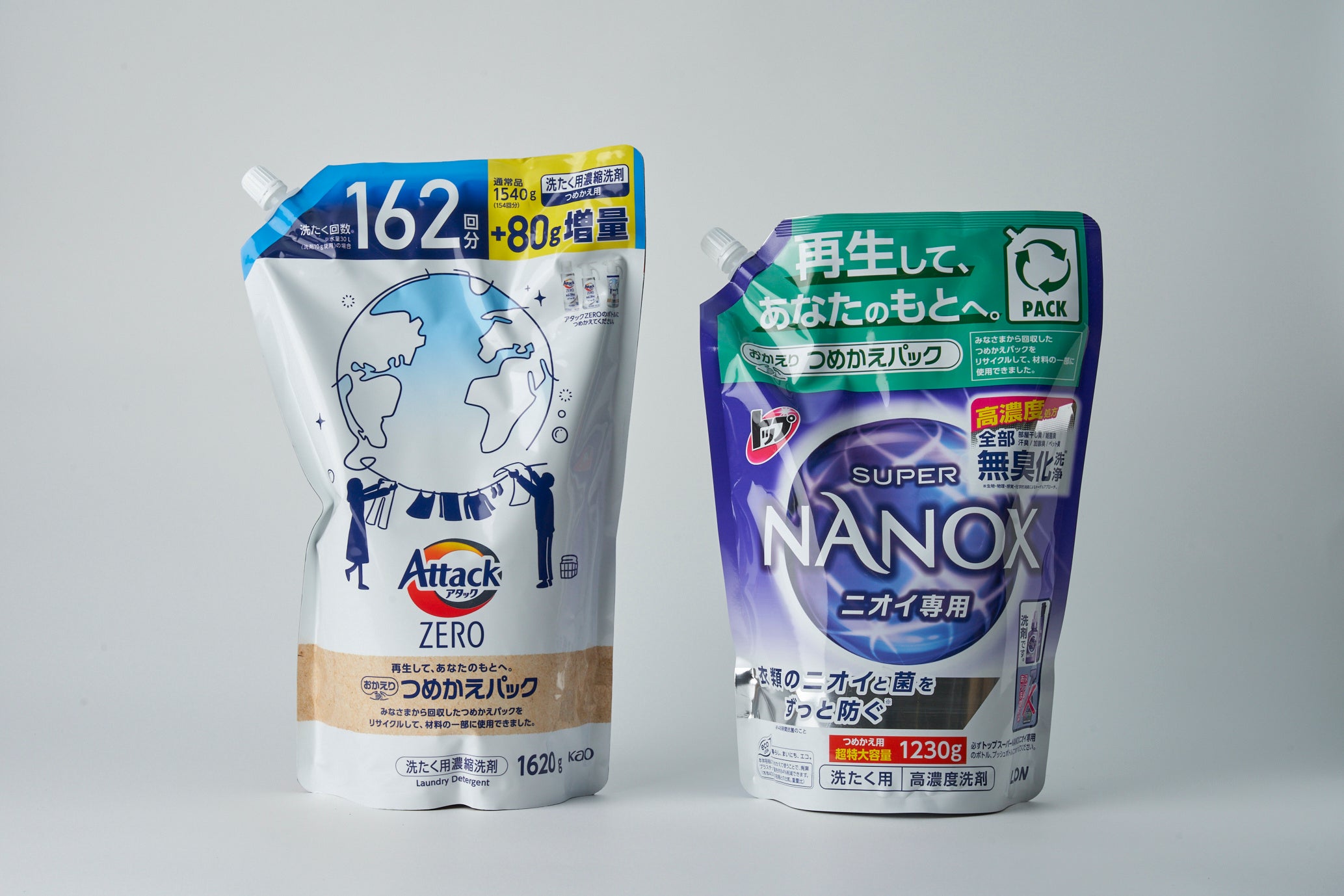 花王株式会社(社長・長谷部佳宏)とライオン株式会社(社長・竹森征之)は、このたび、使用済みの容器を再び同じ種類の容器に戻す水平リサイクルにより、再生材料を一部に使用したつめかえパックを、初めて製品化しました。両社は2020年9月に、プラスチック包装容器資源循環型社会の実現に向けた連携を発表。フィルム容器(つめかえパック)のリサイクルに取り組んできました。その協働の成果として、花王は衣料用濃縮液体洗剤『アタック ZERO つめかえ用(1,620g)』を、ライオンは洗濯用液体高濃度洗剤『トップ スーパーNANOX ニオイ専用 つめかえ用超特大』を2023年5月29日から順次、一部店舗*1にて数量限定発売します。