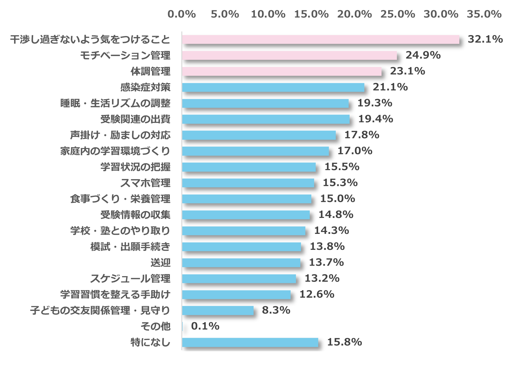 受験をサポートする中で、特に負担に感じることについて調査したところ、最多回答は「干渉し過ぎないよう気をつけること(32.1%)」、次いで「モチベーション管理(24.9%)」、「体調管理(23.1%)」と続きました。