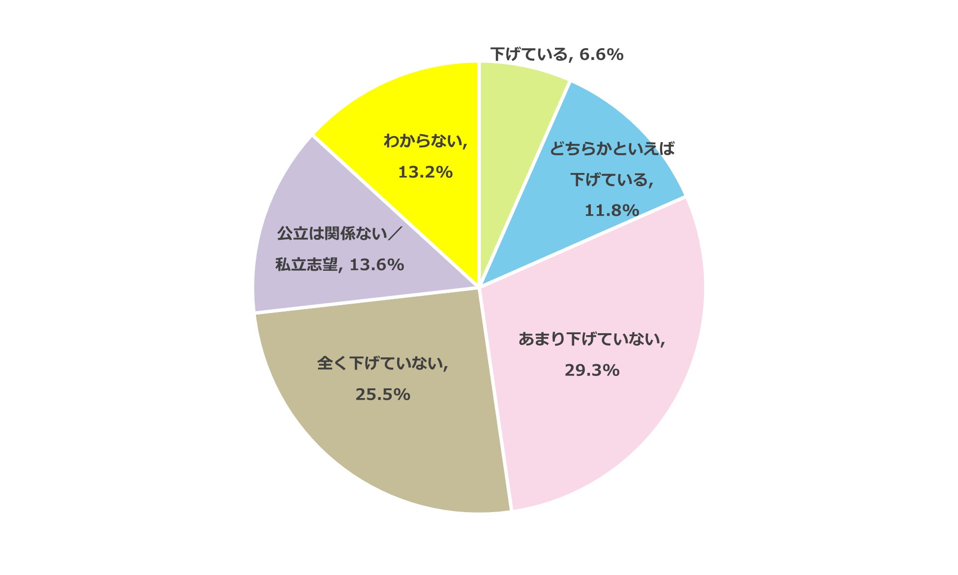 公立高校の単願制が志望校選びにどのような影響を与えているかを調査したところ、「難易度を下げている」と回答した家庭は18.4%(下げている:6.6%、どちらかといえば下げている:11.8%)に留まりました。一方で、「下げていない」と回答した家庭は54.8%(全く下げていない:25.5%、あまり下げていない:29.3%)と半数を超える結果に。