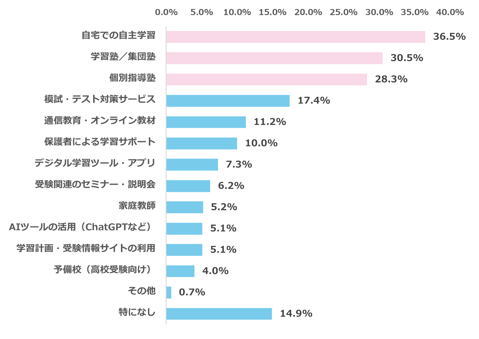受験対策のために、利用している主なサービスや手段について調査したところ、最多回答は「自宅での自主学習(36.5%)」、次いで「学習塾/集団塾(30.5%)」、「個別指導塾(28.3%)」と続きました。