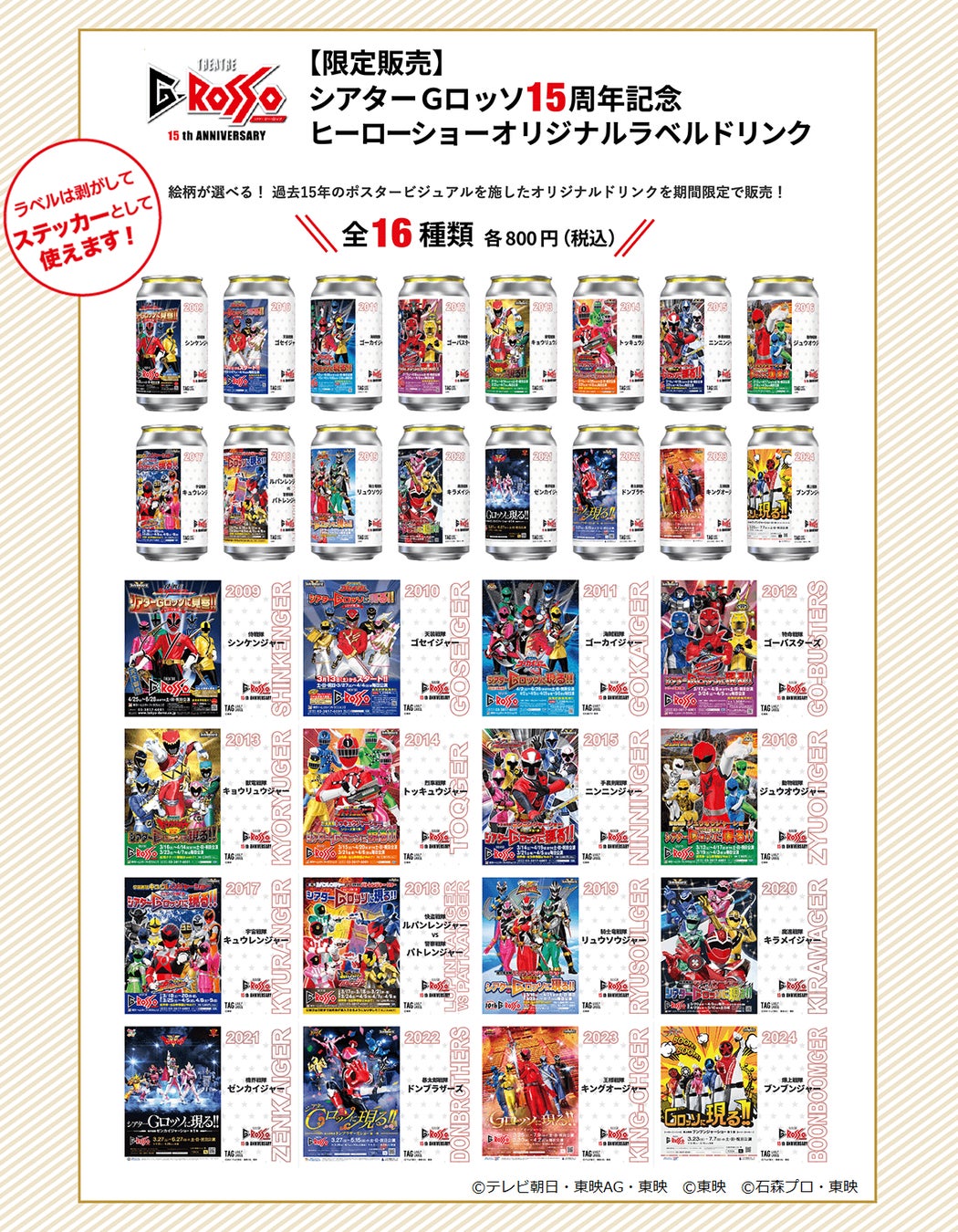 シアターGロッソ15周年を記念して、過去15年・16戦隊分のポスタービジュアルを施したオリジナルラベルドリンク(ウーロン茶)を期間限定で販売します。