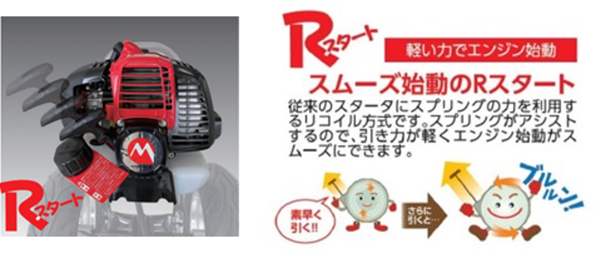 国内メーカーの丸山製作所の2サイクルエンジンを搭載し、高出力なエンジンで、草絡みに負けないスムーズな作業性を実現しました。また、従来のスタータにスプリングの力を利用するRスタートを採用することで、スプリングのアシストにより、軽い力でエンジン始動ができます。