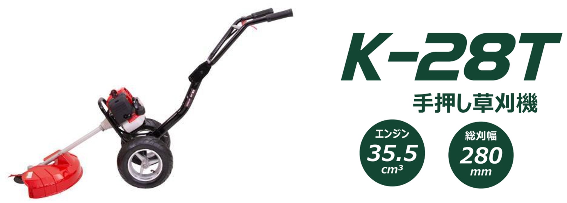 「手押し草刈機 K-28T」は通常の刈払機とは異なり、持ち上げる必要はなく、地面を押し進めることで草刈りができます。大型タイヤを採用し、刈払機では刈りにくいデコボコ道の草刈りもスムーズに行うことができます。