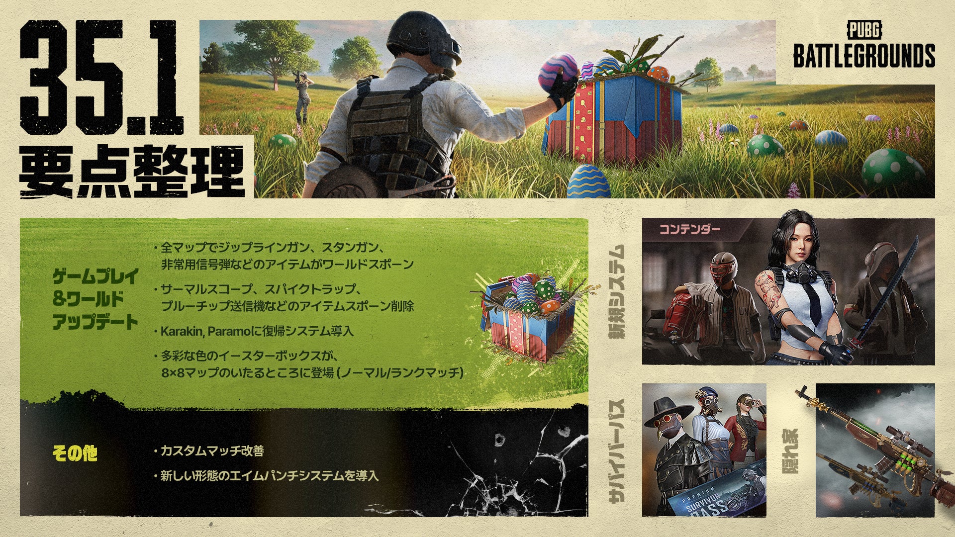 KRAFTON JAPAN株式会社(代表取締役 イ・カンソク)は、『PUBG: BATTLEGROUNDS』(以下PUBG)において、アップデート35.1をライブサーバーに適用しました。