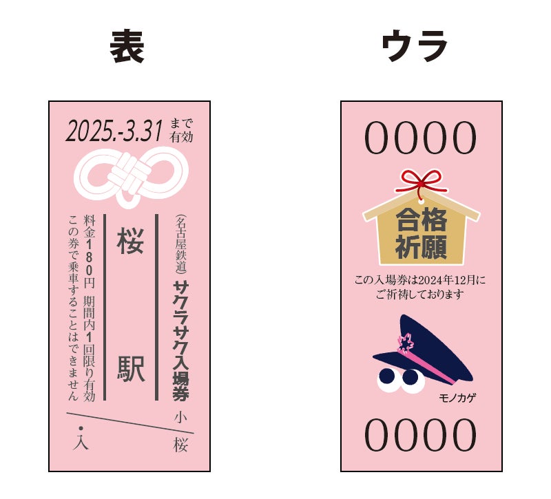 今年は受験生の合格を願い、「桜駅」の硬券入場券と、名鉄電車のイラスト入り御守袋(2000系または7000系デザインの2種)をセットにして発売します。